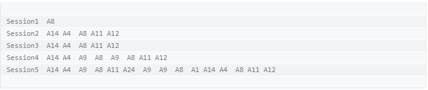 In the above dataset, each row corresponds to a session. The first column contains the session names, while the rest of the columns denote the actions (represented by A8, A14, A9, and so on) performed by the user during that particular session.