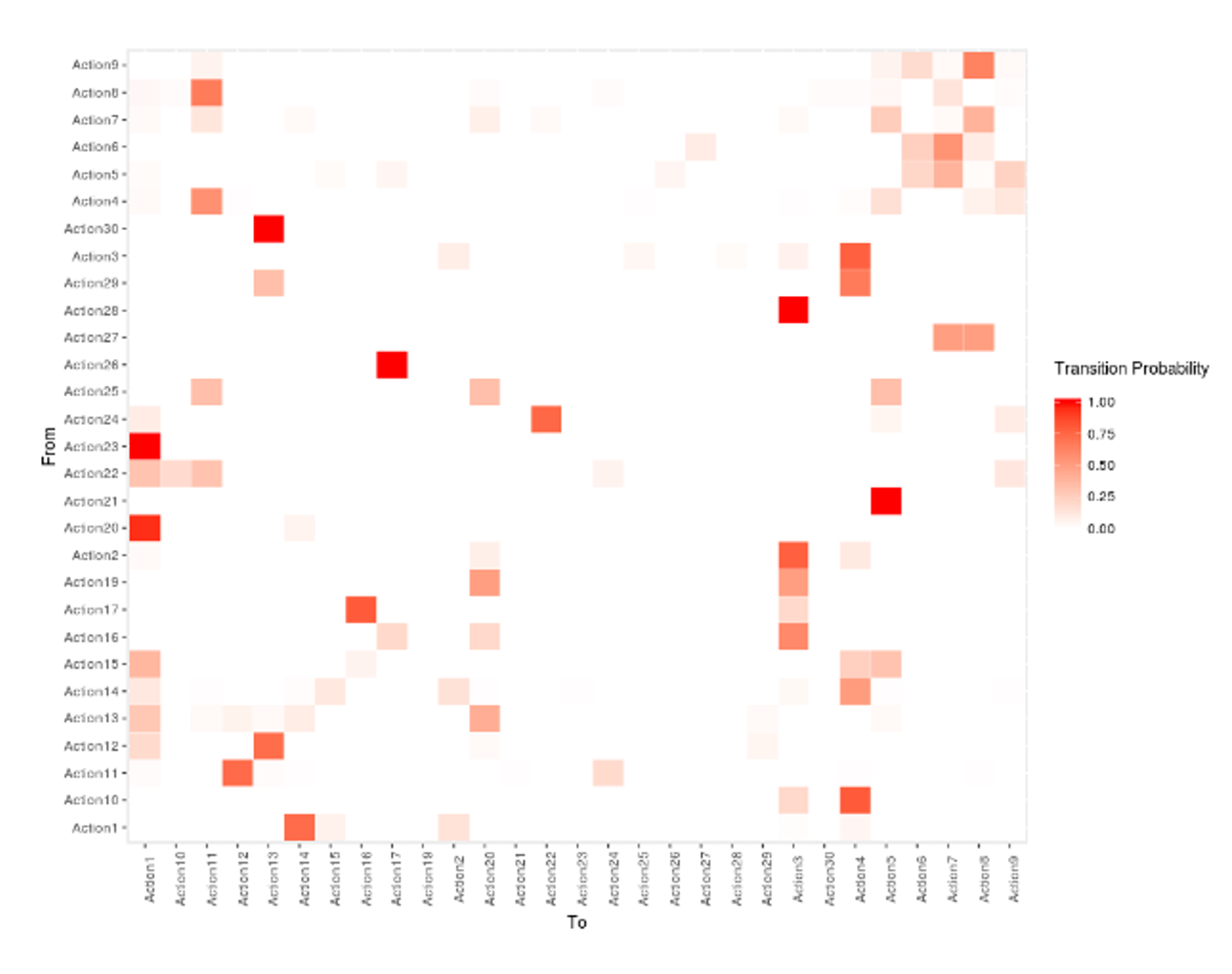 For example, the transition from Action23 to Action1 is more probable than the transition from Action21 to Action1.