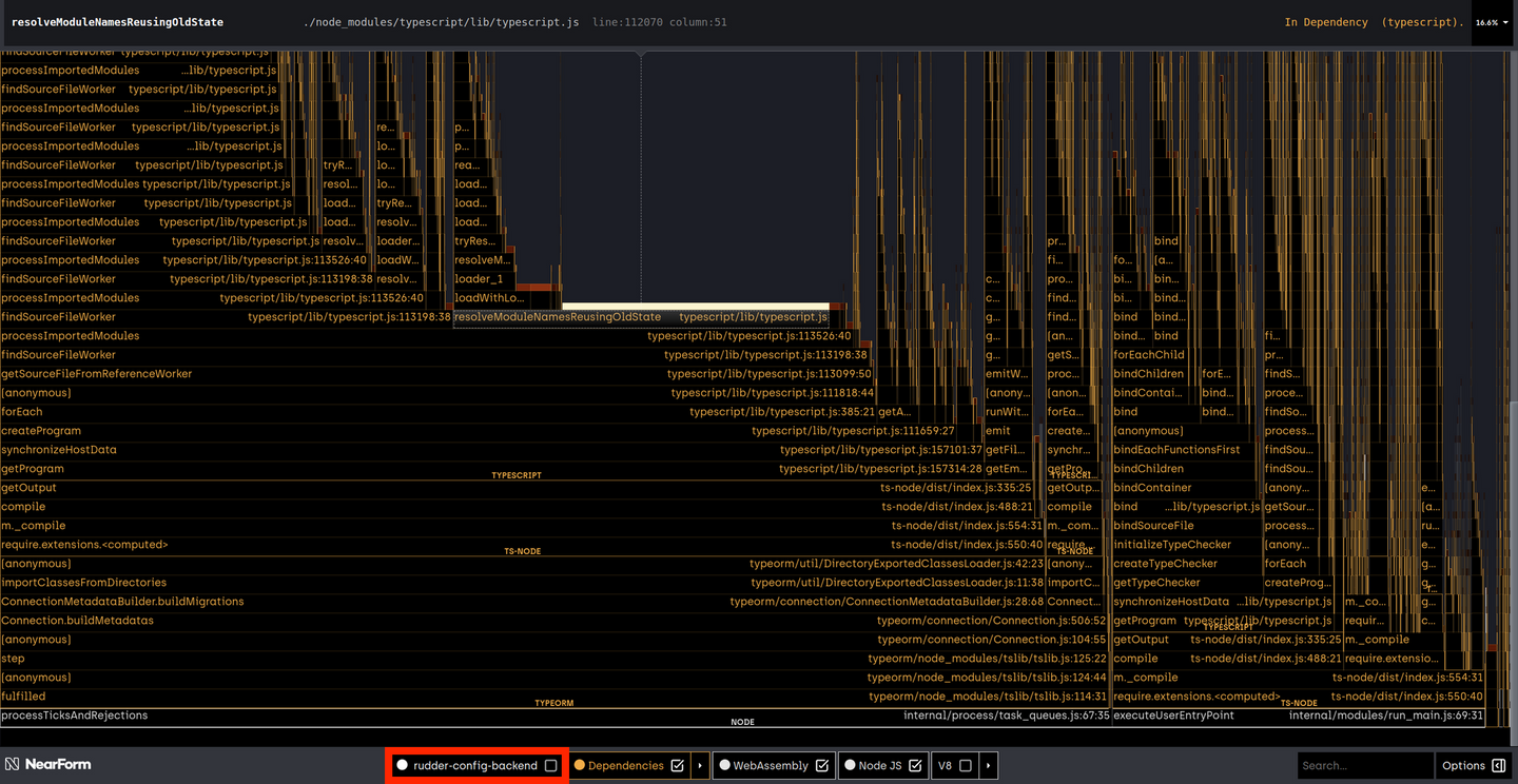 The graphs were the same whether the rudder-config-backend source code was included or not, so we knew the source code wasn’t the issue, and we were able to determine that the overhead came from Typescript, specifically, ts-node.