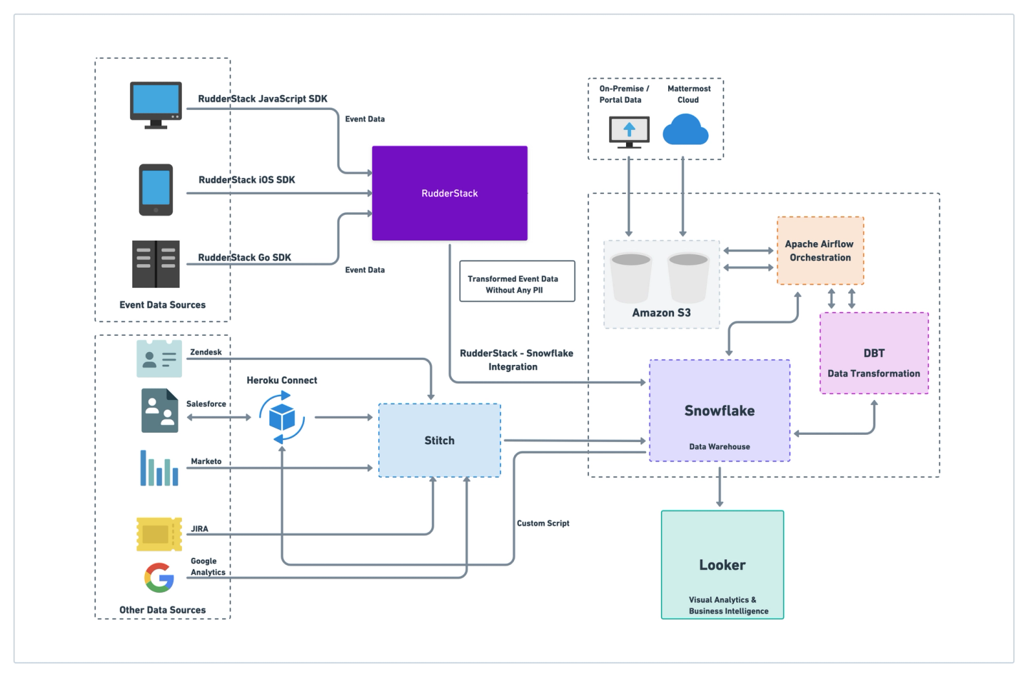 - Data Collection and Synchronization – RudderStack SDKs, Stitch Data, Heroku Connect, Custom Scripts