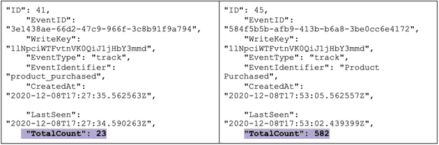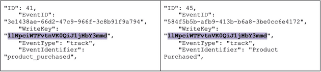 The next thing we want to check in our investigation is the source of the different product purchased events. We will use this information to determine if they are coming from different SDKs. When we look at the WriteKey for each event, we notice that these events are coming from the same source: