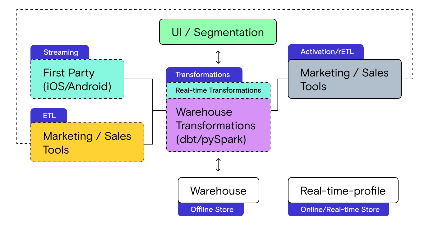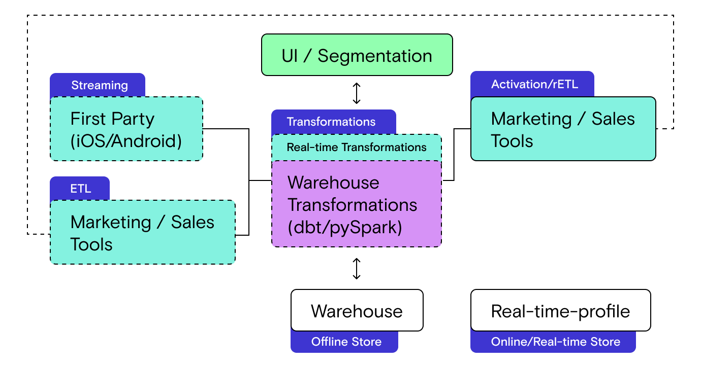 More importantly, these glued together solutions do not support some critical data paths. Because the tools don’t talk to each other directly, they require the data warehouse as an intermediary (as a source or a destination), which means they cannot support real-time streaming use-cases. This is a deal breaker for any company that may implement real-time personalization now or in the future.