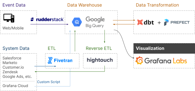 To make this even more real, let’s look at an example architecture from an actual company. Grafana is an open-source analytics and visualization tool that offers querying, alerting, and more to help companies understand their data. They wrote about the stack they use to drive business intelligence and included an excellent architectural diagram of the Growth Stack.